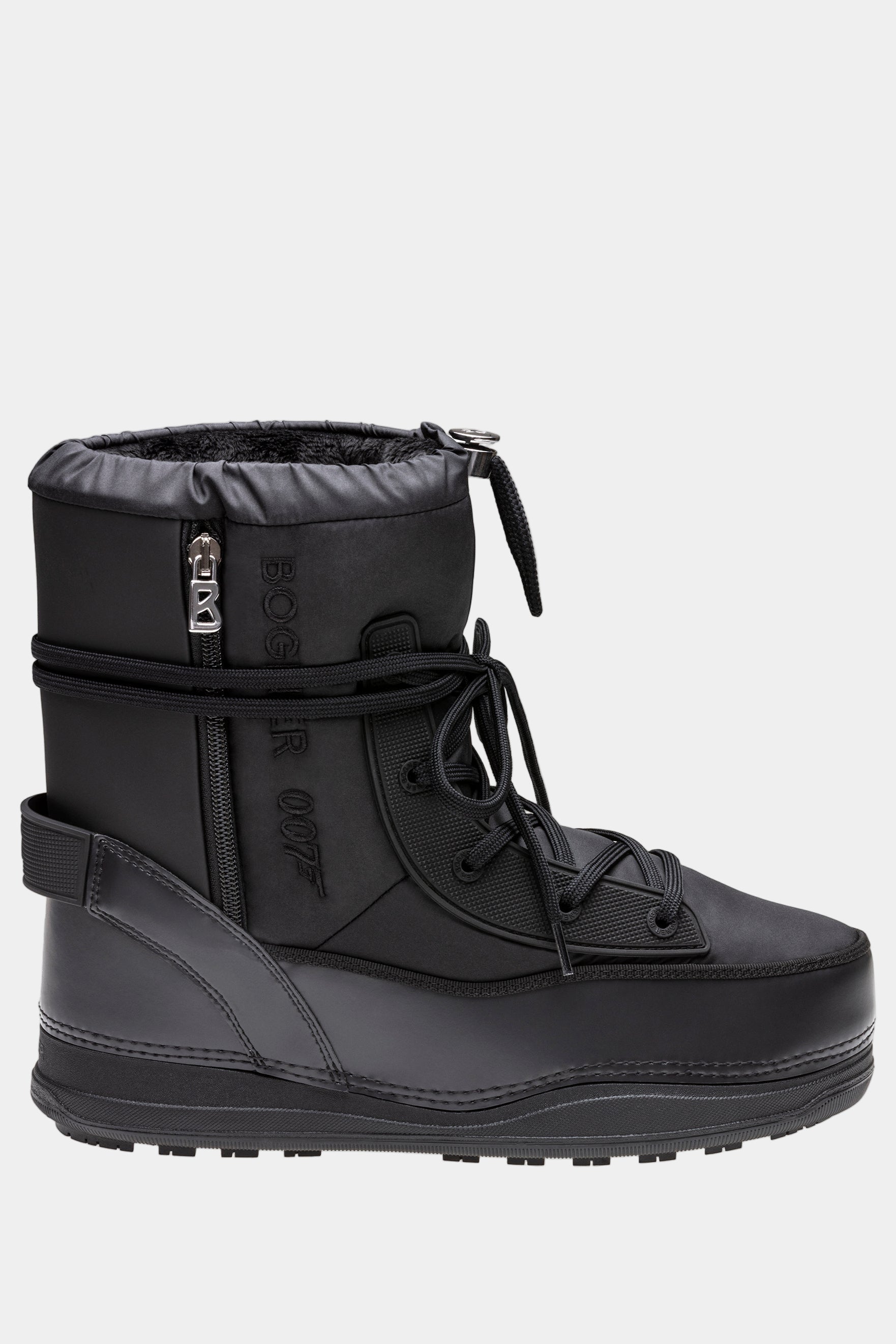 The Laax 007 snow boots impress with a design mix of faux leather and tech sections, complemented by the drawstring with stopper, the lacing and the side zipper. Tonal stitching and metallized logo details accentuate the design. The warming Microvalboa inner boot and the profiled Michelin sole for grip on slippery and snowy surfaces ensure comfort.