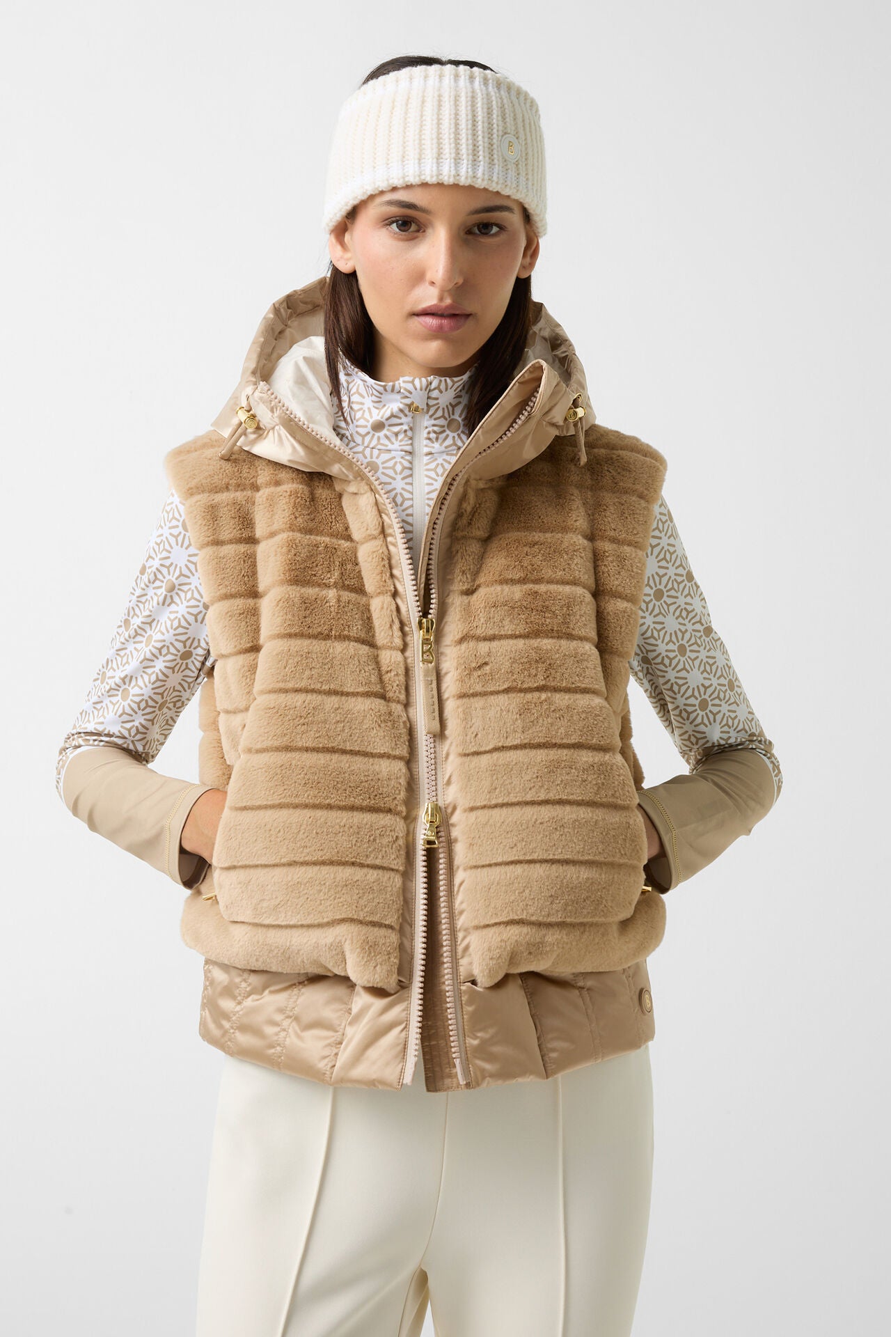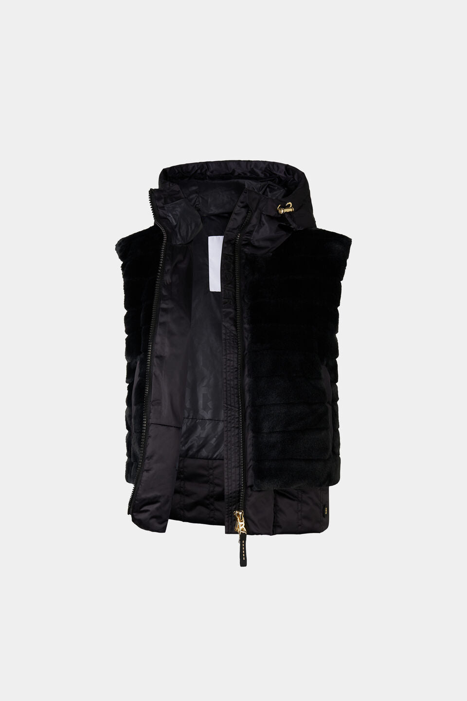 As a key piece for the piste look, the Yumi gilet impresses with its design mix of faux fur and satin, iconically complemented by label details. The adjustable hood and inner waistband provide comfort and protection from the wet and snow. Goose down and feather padding provides a warming finish.