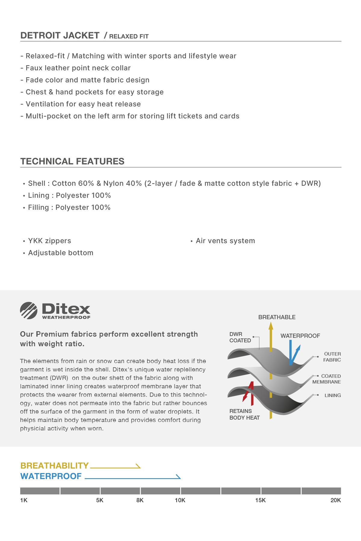Waterproof : 10K / Breathability : 8K